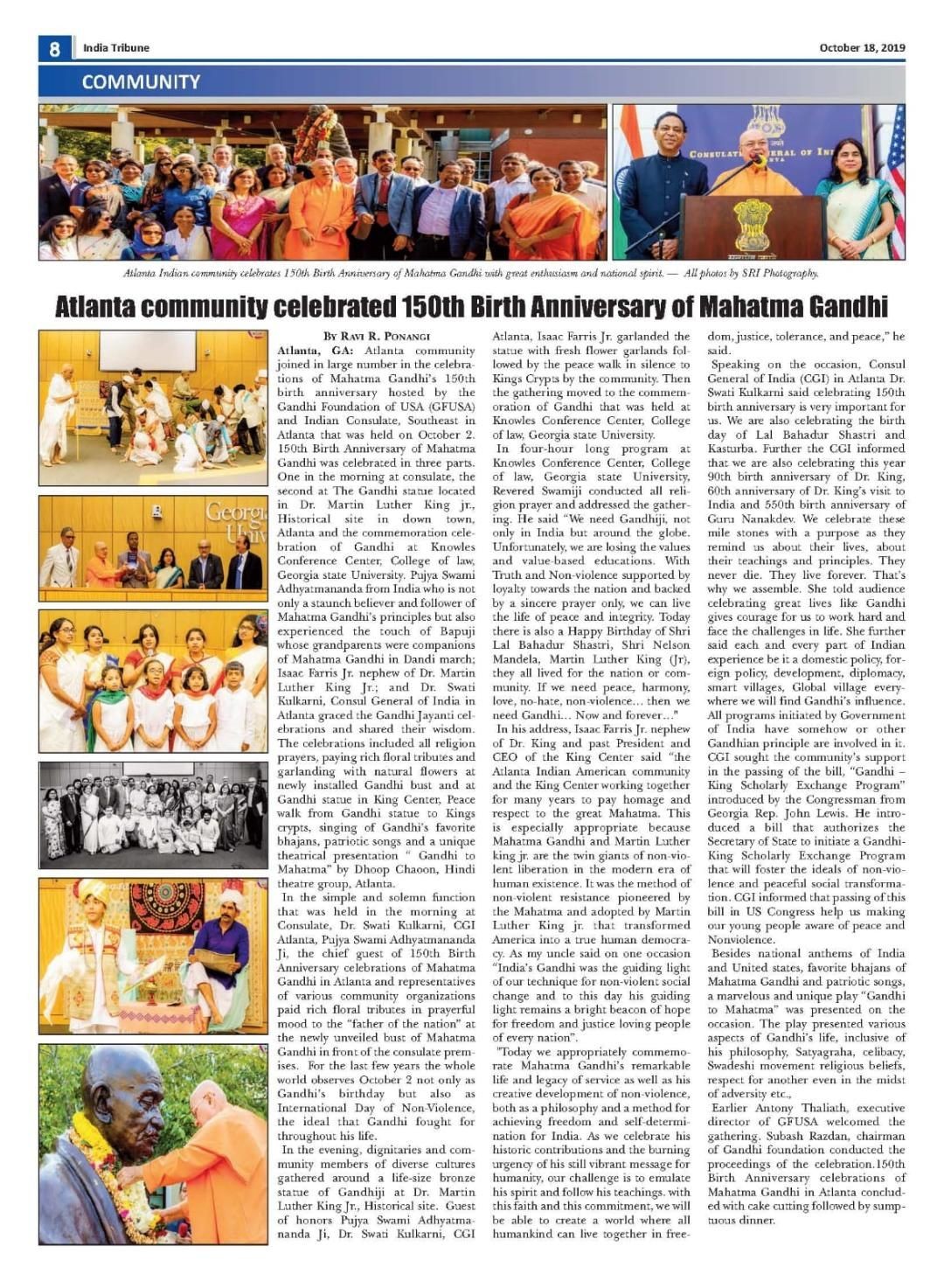 General of India in Atlanta graced the Gandhi Jayanti celebrations and shared