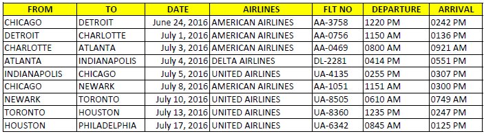 Internal Travel flight details (USA & Canada)