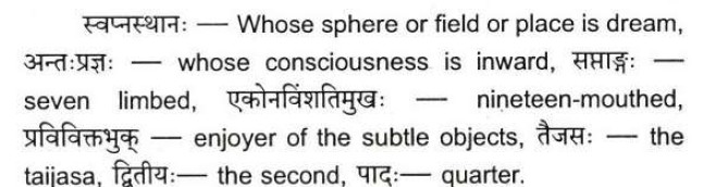The second quarter is the Taijasa whose sphere or field or place is dream, who is conscious of internal objects, who has seven limbs and nineteen mouths and enjoys the subtle objects.