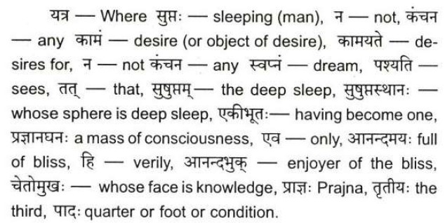 Anandamaya: full of bliss. This is not absolute Bliss. This is not Bliss Infinite of the Atman. This is not the positive transcendental and highest bliss of Brahman, of Nirvikalpa Samadhi. The mind is in a state of quiescence as there is no Sankalpa-vikalpa, thought and doubting. It is free from trouble. This is a negative condition of happiness. There is freedom from unhappiness.