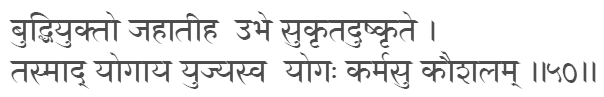 Evenness of mind is called Yoga.( 2:48) Endowed with wisdom (evenness of mind), one casts off in this life both good and evil deeds; therefore, devote thyself to Yoga; Yoga is skill in action.(2:50)