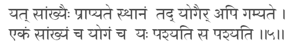 That place which is reached by the Sankhyas or the Jnanis is reached by the (Karma) Yogis. He sees who sees knowledge and the performance of action (Karma Yoga) as one. (5:5)