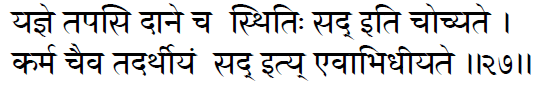 Steadfastness in sacrifice, austerity and gift, is also called Sat, and also action in connection with these (or for the sake of the Supreme) is called Sat.(17:27)