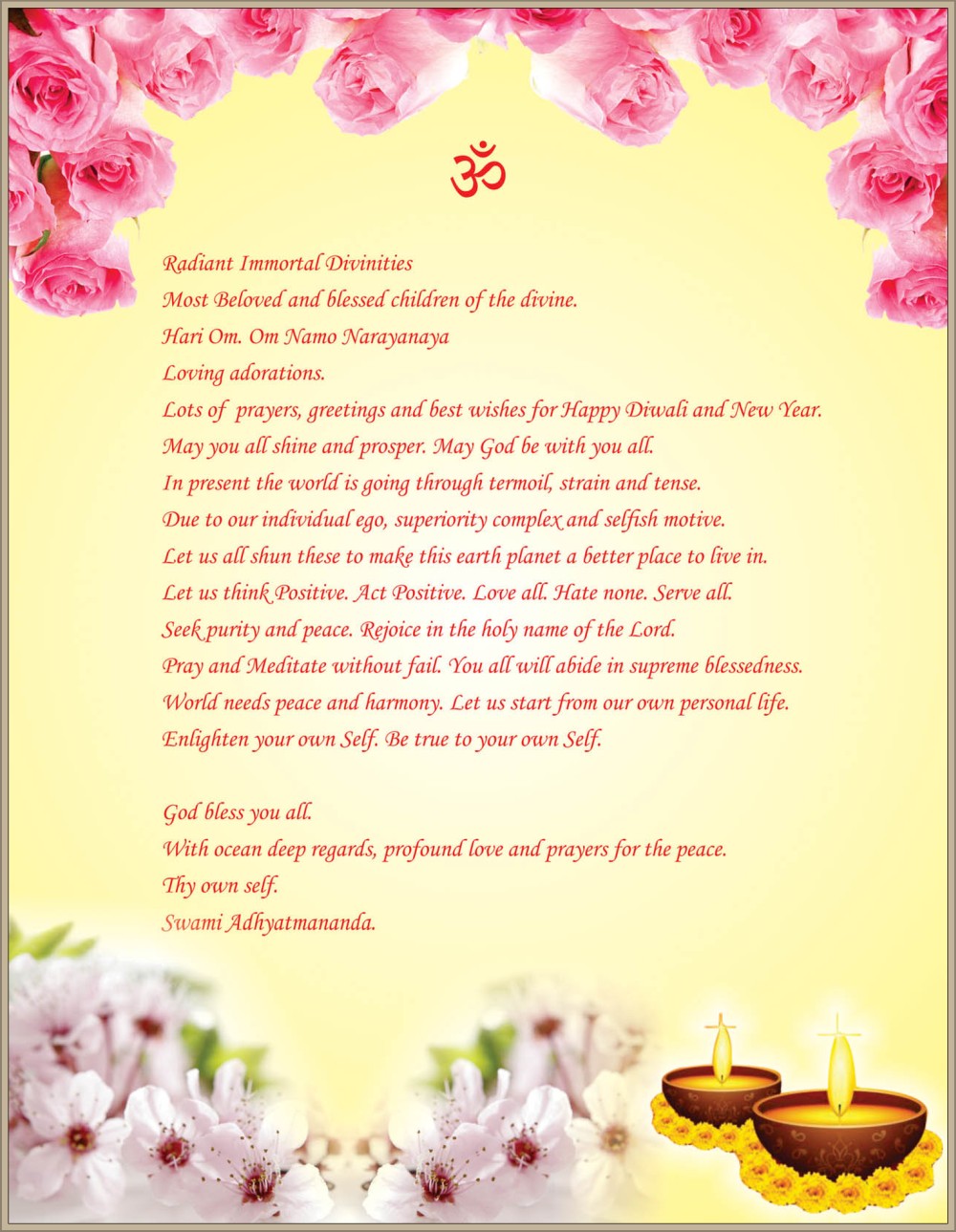 in this light of lights and enjoy the supreme Deepavali""O Ram! The light of lights, the self-luminous inner light of the Self is ever shining steadily in the chamber of your heart. Sit quietly. Close your eyes. Withdraw the senses. Fix the mind on this supreme light and enjoy the real Deepavali, by attaining illumination of the soul." "May you all attain full inner illumination! May the supreme