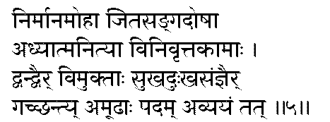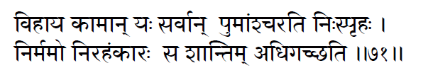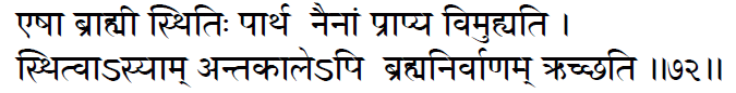 egoism.(2:71) This is the Brahmic seat (eternal state),O son of Pritha! Attaining to this,none is deluded.Being established therein,even at the end of life one attains to oneness with Brahman.(2:72)