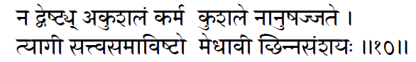 The man of renunciation, pervaded by purity, intelligent and with his doubts cut asunder, does not hate a disagreeable work nor is he attached to an agreeable one. (18:10)