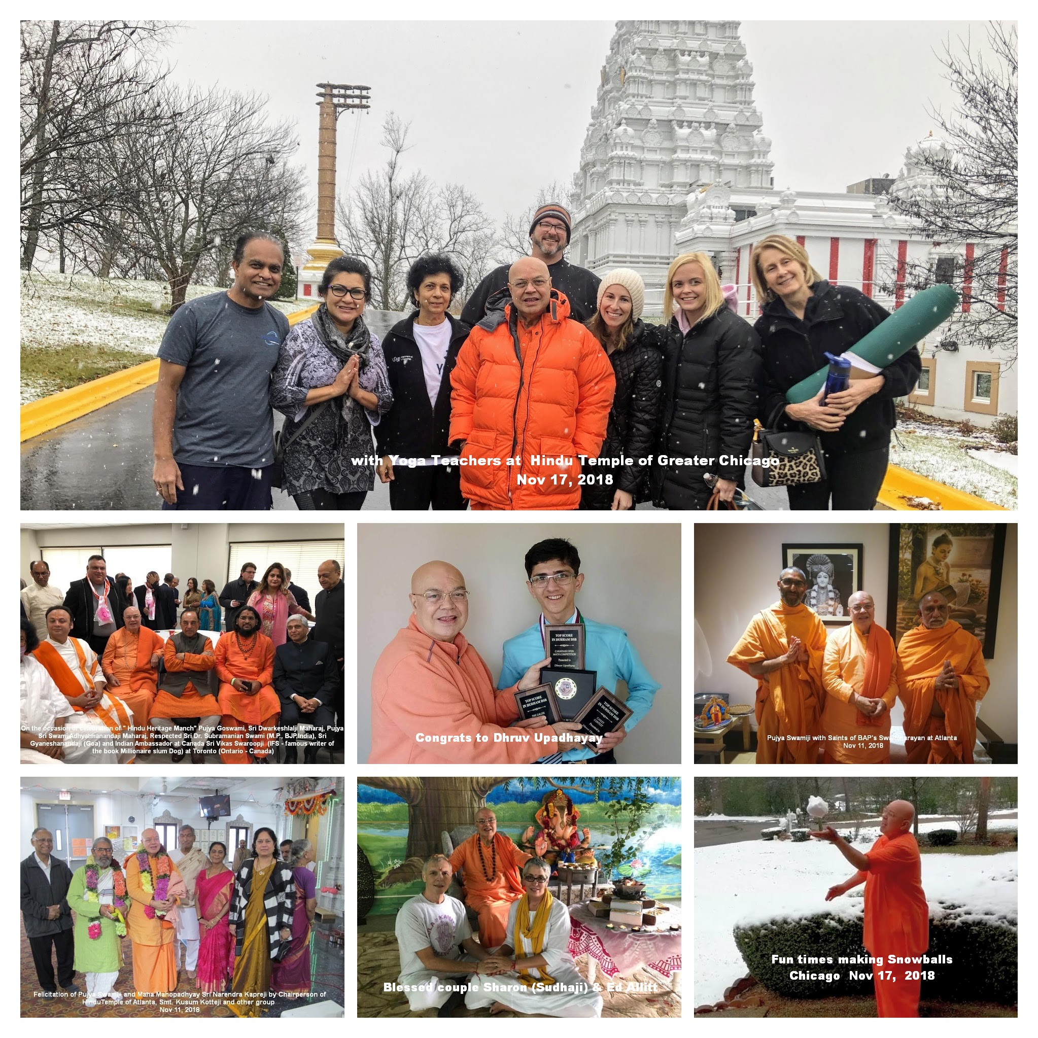 On the last day of concluding of Adhyatma Tour 2018, it was beautiful snowfall at Chicago, as if nature was showering blessings on Pujya Swamiji. It put swamiji into childhood mood, he had fun playing in the snow making snow balls. The Tour 2018 concluded with a grand yoga session at Hindu Temple of Greater Chicago. In spite of a snowy day large numbers of Yoga lovers attended the morning session from 8.30 am to 10.30 am. The Tour continued to UK from Nov 17, 2018 to Nov 30, 2019.
