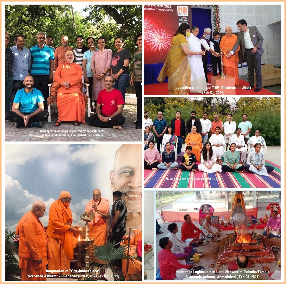 Highlights of Events in the month of February 2021 : Gita Jnana Yajana (Feb 2, 2021, to Feb 6, 2021) by Pujya Sri Swami Vishnu Teerthji Maharaj of renowned Brahma Vidaypeeth Kailash Ashram at Rishikesh was organized at Sivananda Ashram, Ahmedabad. Reiki Seminar for First & Second degrees and Regular Yoga classes in small batches went well as well, Devotees felt blessed to join Homatmak Lugurudra performed at Lord Viswanath Temple. And needless to say that Monthly Narayan Seva - food distribution to underprivileged families was carried out diligently by Ashram's Karma Yoga Team, as always.