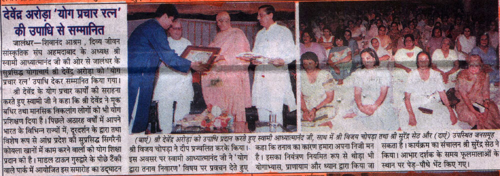 June 9th Sri Devendra Aroraji was awarded “Yoga Prachar Ratna” by Pujya Sri