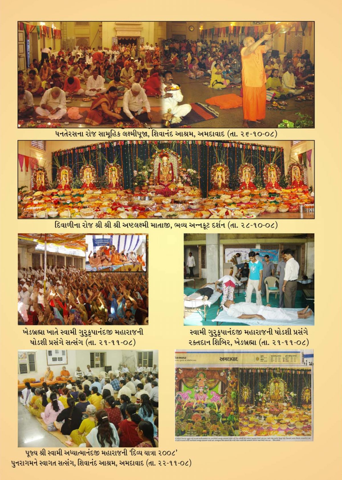 Diwali Celebration (Oct 26, 2008 - Oct 28, 2008) & Diwali Prasad : While devotees received "Vaishnav Jan", a Diwali gift; Prasad booklet containing Spiritual food & Blessings of H. H. Sri Swami Adhyatmanandji Maharaj, families in underprivileged area of the town received "Diwali Annakoot prasad" of Maa Sri Ashtalaxmi from Sivananda Ashram, Ahmedabad. Sri Sri Sri Ashta Laxmi Bhavan and Ashram was decorated with lighting, rangoli, pushpamalla during Diwali celebrations. Devotees prepared & offered a grand Annakoot to Maa Shree Ashtalaxmi on Diwali day which marks the culmination of Diwali festival. On Dhanteras day (Oct 26th), a large number of devotees joined for group Yantra Pooja at Sri Sri Sri Maa Ashta Laxmi Bhawan.On Diwali day (Oct 28th), several thousand people visited ashram for Annakoot darshan and received the Lord's Blessings. It was a great time, a time to rejoice in the Lord, Thanks Giving time for one and all, Young and Old. The Karmayoga in the real sense began after Diwali Annakoot, as all type of sweets, snacks, chocolates, cakes, fruits, offered to Maa gets packed up nicely in small packages by devotees during the night at the ashram and were distributed on next day, a New Year day to Daridranarayanas in slum area of the city.