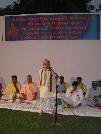 The Akhil Bharat Sanskrutik Vikas Trust arranged Shri Saraswati Yajna at the Sivananda Ashram. Twenty-one Brahmins participated in this holy “Yajna”. Recitation of twelve and half lakhs mantra were done during the five days Yajna. Revered Sri K. K. Shastriji ( 100 years old) attended this Yajna, along with Pujya Shri Ramdasji Maharaj of Santram Mandir and Gaubhakta Shri Chaitanya Shambhu Maharaj. At concluding ceremony of Yajna, Maha Mahimopadhyaya Shri K. K. Shastriji addressed a large gathering at the ashram. He shared the secret of his good and long healthy life. He recited “Sri Siddha Saraswati Strotra” daily, which was handed over to him by his father. On behalf of Sivananda Ashram, Shri Arunbhai Oza felicitated Shri K. K. Shastriji and all the saints and guests present on this occasion.