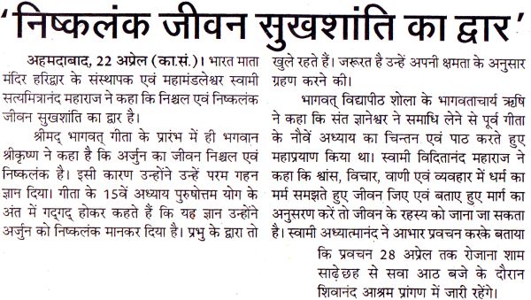 April 30, 2007 to May 3, 2007 morning discourses on the subject of Ashtanga Yoga of Maharshi Patanjali were organized. Rev. Sri Swami Adhyatmanandaji Maharaj & Dr. Swami Muktanandaji Maharaj from Alwar,(Rajasthan) addressed a large gathering. At night Sri Bijoy Shivram, a talented dancer and versatile genius presented a dance performance on theme of "Jai Jai Shankara" (Shankaracharya)