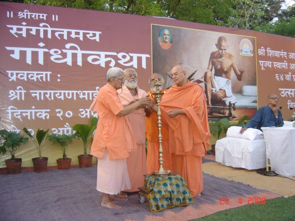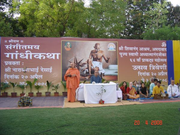 The Gandhi festivity continued for nine days and concluded on April 28, 2008. The concluding session describing Mahatma Gandhiji's assassination was very emotional and made every one shade tears. H. E. Governor of Gujarat Pandit Sri Nawal Kishor Sharmaji graced the concluding session. He honored Sri Narayanbhai Desai with the title of "Gandhi Prachar Ratna". Sri Narayanbhai Desai is presently a vice-chancellor of Gujarat Vidhyapeeth, established by Pujya Mahatma Gandhiji. He was also honored a prestigious "Murtidevi" award for his great work 'My Life Is My Message'.