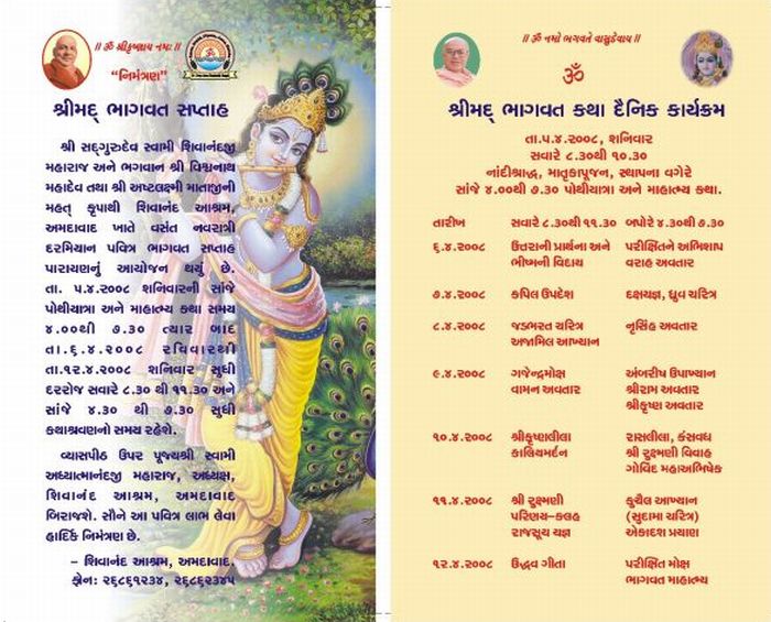 Srimad Bhagvat Katha (April 5, 2008- April 12, 2008) A week long Srimad Bhagvat Saptah was organized at holy Sri Ashtalaxmi Bhavan. To listen to Srimad Bhagvata Katha itself is a great fortune and that too, from H. H. Sri Swami Adhyatmanandaji Maharaj is indeed a spiritual feast for a blessed soul. Holy Sri Bhagavat Saptah began with a colorful procession, called Shobha Yatra with Sri Lalaji (cute little Baby Krishna) with hundreds of devotees rejoicing and dancing Hari Nam Sankirtan. All the devotees had a wonderful experience listening to the glories of the Lord Sri Krishna. Concluding of Bhagvat Katha was also great with Mahaprasad serve to all.