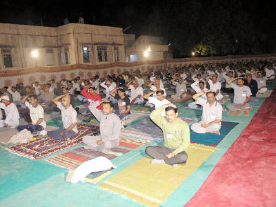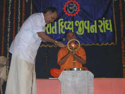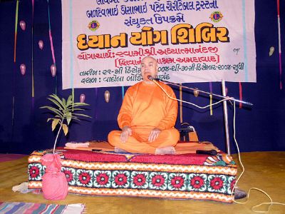 Gujarat Divya Jivan Sangh organised Sri Swamiji’s week long Yoga, Meditation camp at Vadodara. Evening discourses on the Subject of “Gita in Daily Life” was held at the Diwane - Khas auditorium of Sri Sayaji Rao Medical College, Baroda.The camp was organized by a team of dedicated and hard working people, including Sri Upendra Purohit, Sri Diwakar Trivedi, Sri Prabhudas Patel, Sri K. M. Swadia and others.Yoga instructors Sri Mehul Shah, Sri Harit Swadia and Sri Pancholimama of Surendranagar assisted Swamiji in the morning yoga sessions. Dr. Kamal Pathak, a dean and superintendent of S. S. G. Medical College, Sri Bhagyesh Iha (IAS), collector of Baroda dist. and H. H. Sri Swami Brahmatmanandaji Maharaj also attended the morning yoga classes and evening discourses. Smt. Prema and Dr. Mrugank Merchant hosted Swamiji Maharaj and served him with great reverence.