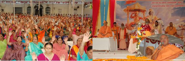 A Jnana Yajna was organized by a regional daily news paper “SANDESH” and sponsored by ISCON. It was a grand event in Ahmedabad. Erudite scholars and enlightened religious heads from various sects shared the words of wisdom. Opening function was attended by Sri Swami Adhyatmanandaji Maharaj. Swamiji addressed the large assembly on Feb 27, 2008. A mammoth crowd was touched by his discourse on the subject of “Vaishnav Jana to Tene Re Kahiye”; It was impregnated with Bhakti, Jnana & wisdom. He said that Religion is not in the Temple or Mosque or Church or in Gurudwara and so “Vaishnav” is not Hindu only. Then, who is a True Vaishnava (Devotee of the Lord)? He, who neither attaches himself to anything nor does he have any aversion to things. He, who has a balanced mind under all circumstances and not agitated by the happenings of the world, nor does he himself cause any agitation in others. He, who is perfectly desire less, rejoices in the Lord within and sees equality everywhere, being untouched by sorrow, fear, honour as also dishonor. He, who is perfectly content and has surrendered his entire being to the Lord, is a “True Vaishnav”. Swamiji also attended concluding function on Feb 28, 2008.