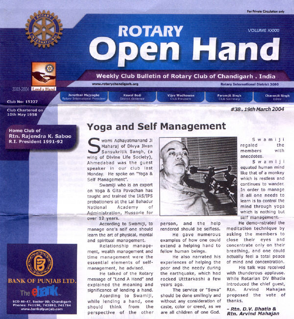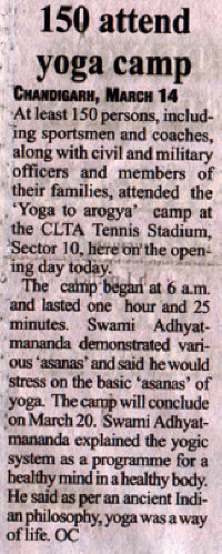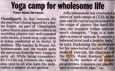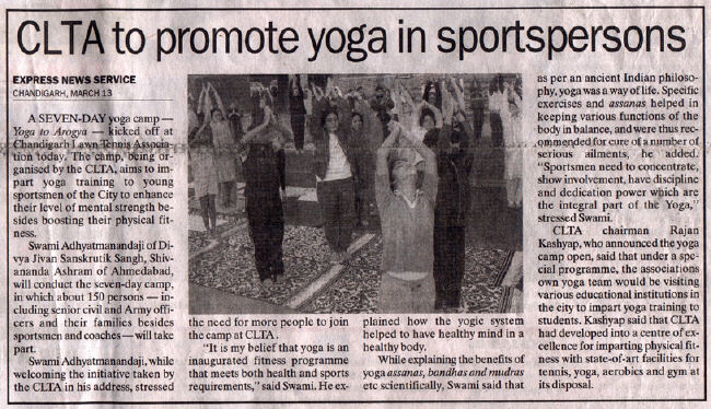 Chandigarh Lawn Tennis Association President Sri Rajan Kashyap (I.A.S.) & Chief Secretary organized a Yogasan, Pranayam and Dhyana Shibir. It was attended by large numbers of youth including Cricketers and Tennis players. Sri Katariyaji Commissioner Finance of the Punjab Government inaugurated this camp. Extensive coverage by media was given to this yoga camp.