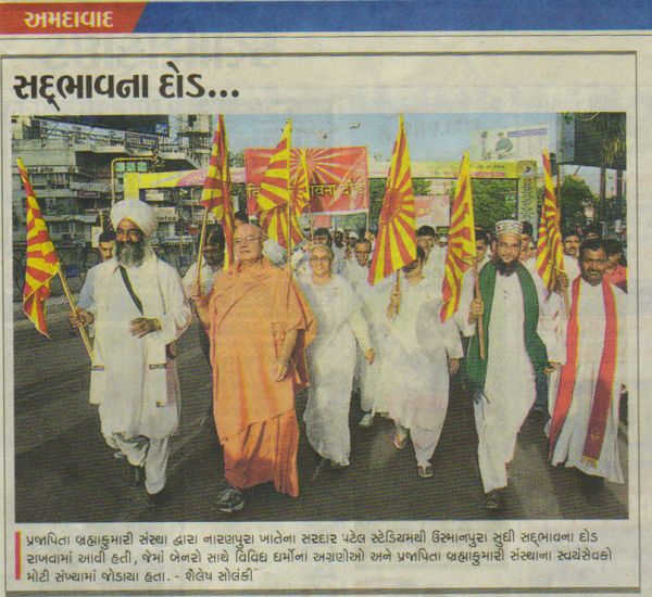 "Run for Harmony" (May 25, 2008) Brahmakumaris invited Sri Swami Adhyatmanandji Maharaj to lead the 'Run for Harmony'. Heads of Muslim League, Father from Holy Church, Gyani from Gurudwara and Dastur from Parsi Agiyari joined this memorable event..