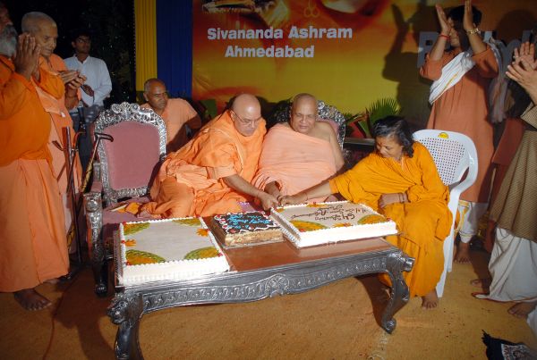 People expressed their love, reverence and gratitude to Pujya Sri Swami Adhyatmanandaji Maharaj in so many different ways & in different words for his praiseworthy work initially at the DLS HQ, Rishikesh and now for creating Sivananda Ashram, Ahmedabad a blossoming spiritual center that provides the field to spiritual aspirant to evolve in their spiritual journey Forward, Onward & Godward. The mammoth gathering had gala time with food and devotional music by Sri Ajay Yagnikji at evening function. Also, the function was highlighted with the release of books "Shiv-Ananda", the Gujarati translations of 'Bliss Divine', 'Japa Yoga', 'Thought Power' of H H Sri Swami Sivanandaji Maharaj and 'Forever Here' of H H Sri Swami Chidanandaji Maharaj. The evening function continued in festive mood that culminated in guided meditation by Sri Swami Adhyatmanandaji Maharaj at midnight. Devotees in their overwhelming devotion performed Aarati and cut the cake. The Mangoes, cake pieces & a calendar were distributed as Prasad to all. Thus the whole day's celebrations concluded very late at night.