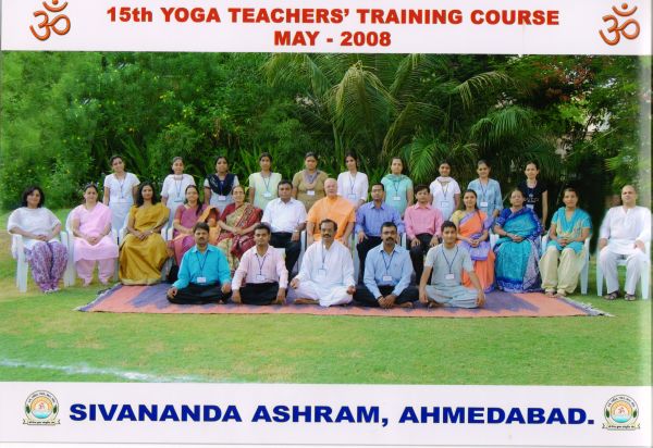Seventeen advanced Yoga students attended and successfully completed YTTC, which was held through "SIVA Yoga Center" at Sivananda Ashram, Ahmedabad, under the guidance and leadership of Sri Swami Adhyatmanandji. Among the students, one came from Thailand , two from USA, one from Haridwar and the rest were from all over Gujarat. Our team of Yoga Teachers including Sri Swami Adhyatmanandaji Maharaj, Dr. Varsha Dave (Gynecologist), Dr. Bharat Trivedi (Dean, VS Medical College), Dr. Amish Kshatriya (Orthopedic Surgeon), Dr. Vishal (Diabetologist), Dr. Ira Patel (Pathologist), Mrs Chiidrupini Kshatriya (Dietician), Smt Roopa Majumdar (Reiki Master), Ms. Sangeeta Thawani (Yoga teacher) conducted the classes during the course. Concluding ceremony was held at Ashram's lawn on May 30, 2008 and Dr. Ramesh Goyal, the Vice Chancellor of the MS University, Baroda distributed certificates to all the participants of the 15th YTTC.