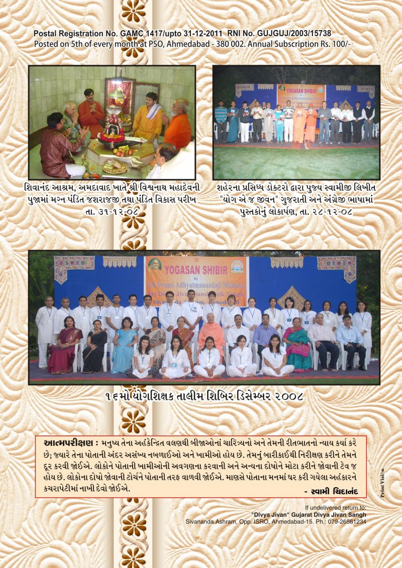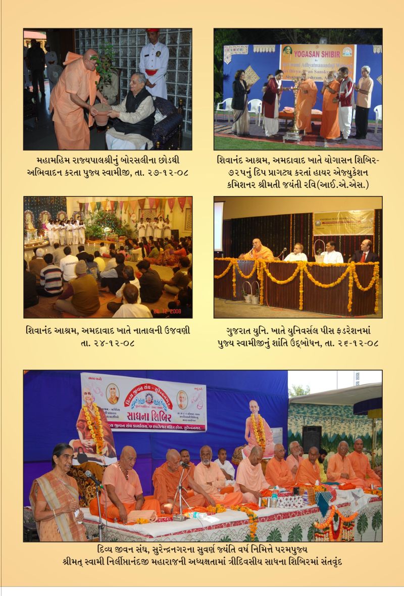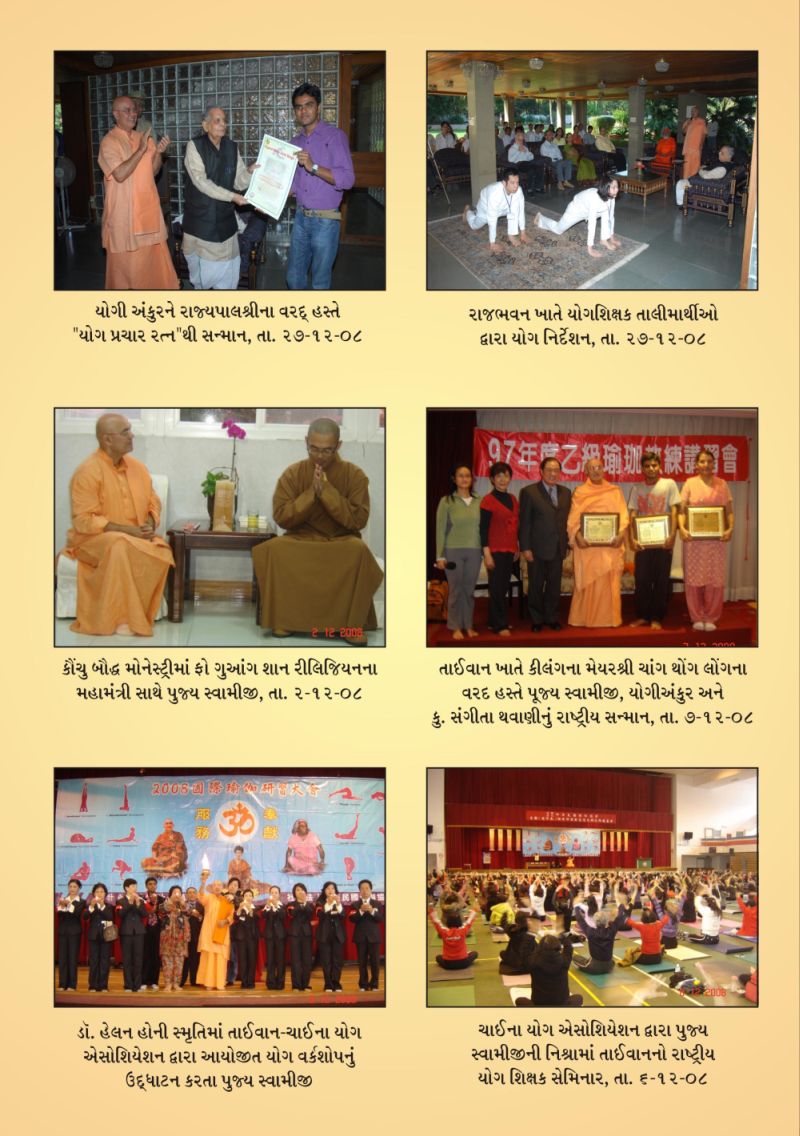 725th Yogasana Camp (Dec 22, 2008 –Dec 31, 2008):  725th Yogasana camp was organized at the Ashram premises. 730 candidates joined the camp. Mrs. Ravi Jayanti IAS, Commissioner for Higher Education inaugurated the camp. Swamiji's book "Yog, a j Jivan" (Gujarati) and its English translation “Yoga, a Way of Life", published by Gujarat Times Publication and Gurjar Granth Ranta Karyalaya were released by Dr. Tejas Patel, Dr. Mayur Patel, Dr. Swetang Pancholi, Dr.Anish Kshatriya and Ina Patel. This book is a compilation of articles (of last two years) published by Gujrat Times weekly news paper from New York and Canada.