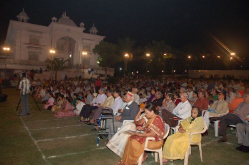 The evenings (8.30pm-10.00pm) , during the week of Bhagavat Saptah, were colorful festival and feast at the ashram lawn. Large numbers of people rejoiced the devotional music singing by different artist groups each day from in and around Ahmedabad. Among them were Shri Shekhar Sen (Mumbai), Smt. Monika Shah (Surmani), Smt. Bansuri Bhatt, Shri Shyamal & Shri Saumil Munshi, Shri Nayan Pancholi, Shri Ram Kumar, Smt. Mayurika Oza, Ms. Shraddha Shah and Shri Ghanshyamdan Gadhavi poured divine music and enchanted the people’s hearts.