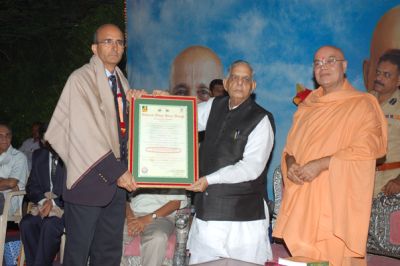 On Nov 18, 2006 was a special evening (8.15 pm - 9.10pm). “Rev. Bapuji”, Dr. Swami Yagnavalkyananda Saraswati’s birth centenary celebration. H. E Governor of Gujarat Pandit Naval Kishor Sharmaji visit brought a special fervor. The evening started with a devotional singing by Pundit Shree Niraj Chandra Parikh. Number of eye surgeons and specialists were honored on this occasion. Among them was Dr. C.L. Verma, C.M.O. Sivananda hospital, Virnagar, Dr. R.R. Doshi (91 years age) Chikhodara - Anand, Dr. Bharat Ghodadara C.M.O department Opthalmology Civil Hospital (Ahmedabad), Dr. Abhay Vasavada (Ahmedabad), Dr. Piyush Matalia and Dr. Bharat Bakshi Jamnagar, Dr. Ashok Shroff (Navasari) by H. E. Governor of Gujarat for their meritorious services to the poor, needy and downtrodden.