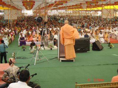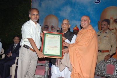 Shree Krishna Pranami sect of famous Khijada Mandir of Jamnagar organized a grand religious program for twelve days celebrating founder’s 350th birthday, which concluded on Nov 6, 2006. Sri Swami Adhyatmanandaji Maharaj was invited among many other saints and dignitaries from all over India, including H. E. Governor of Gujarat and the Chief Minister of Gujarat. Sri Swamiji in his thundering address thrilled the audience. Over one and a half lakhs devotees assembled at this memorable event. Wide media publicity was given to this grand religious gathering. Astha television Channel broadcasted live coverage.