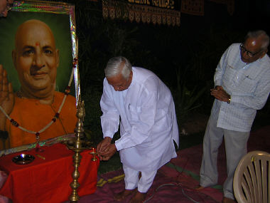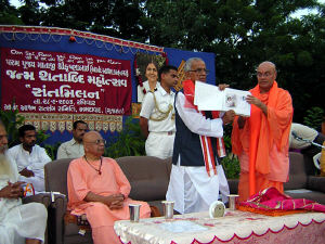 Wednesday, Sept 24, 2003 a Special Satsang and Guru Paduka Poojan was arranged to celebrate Rev. Gurudev Srimat Swami Chidanandaji Maharaj’s 88th birthday.  A divine portrait (13 meters x 3 meters) of Rev. Sri Guru Maharaj was installed in the Chidananda Dhyan Mandir, which was unveiled by H. E Governor of Gujarat , Sri Kailashpati Mishraji. It brings living presence of Sri Guru Maharaj and make this place a perfect place for mediation.