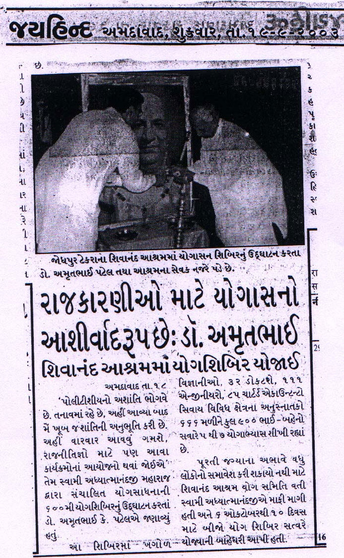 600th Yoga Camp at Sivananda Ashram, Ahmedabad: Sept 15, 2003 Sept 28, 2003