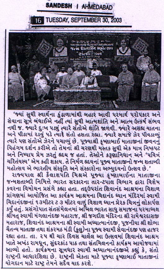 Birth Centenary Celebration of Mother Sri Krishanabai: Sept 25, 2003 Sept 28, 2003