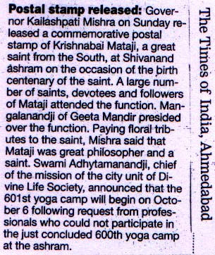 A Memorial Envelop (memorial postal stamp) for the birth centenary celebration of Pujya Sri Krishnabai Mataji was released by H. E Governor of Gujarat , published by postal department of Govt. of India.