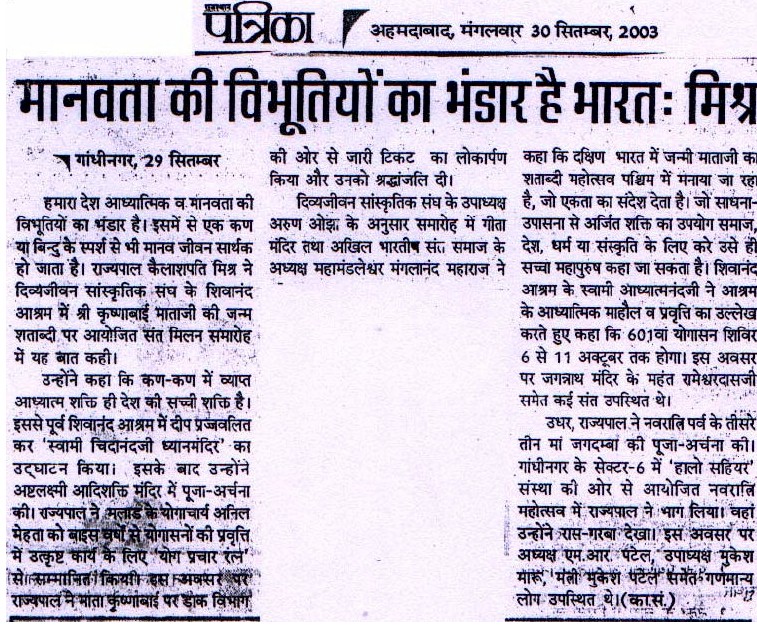 A four day long birth centenary celebration of Sri krishnabai Mataji was organized at the ashram with chanting of Sri Rama Nama, feeding to poor, Sundar Kand path and Sant sammelan. Governor of Gujarat Sri Mishraji, Mahamandaleshwar Sri Mangalanadaji Maharaj  and President of all India Sadhu Samaj, Sri Rameshwardas ji Maharaj, Mahant of Sri Jadish Mandir and many more Saints graced the occasion.