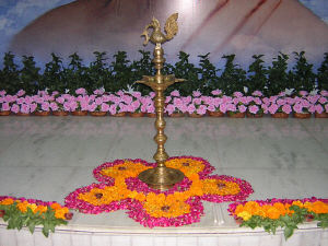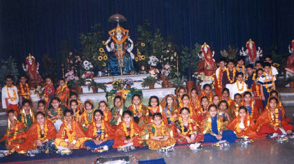 A procession (Rath Yatra) of Sri Sri Sri Chamunda Mataji was organized on Monday Sept 29, 2003  in the local area of Ahmedabad with colorful Purna Kumbha , flags , chariots, drums, musical orchestras , singing and dancing in praise of Holy Mother as a part of holy Sri Navratri festival .