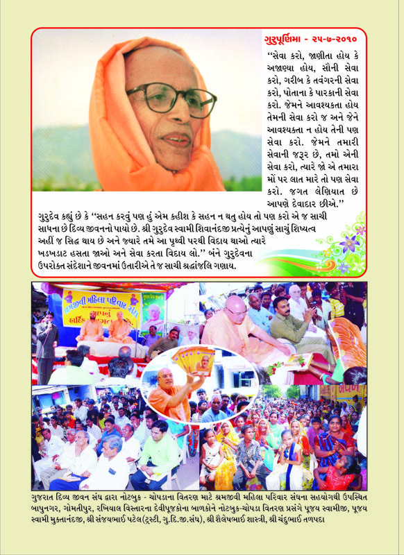Dadiapara- A group of devotees from Sivananda Ashram, Ahmedabad, Bharuch, Ankleshwar and Surat headed by Swami Adhyatmanandaji Maharaj and accompanied by Sri Swami Muktanandaji Maharaj visited tribal colony named Janki Ashram, It is about 70 Km from Ankleshwar. About 165 girls resides in the Ashram and nurtured beautifully. It was matter of a great pride that a few among these girls were extraordinarily talented and had received the rank of 1st or 2nd at state level and national level in study. They were excellent in education, sports, music, dancing and crafts also. They were recognized for their success and awarded. Notebooks also were given to tribal school students by Gujarat Divya Jivan Sangh.