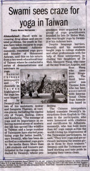 Morning of Sept 9, 2005 a grand civic reception was organized to welcome Rev. Sri Swami Adhyatmanandaji Maharaj by the H. E. Mayor of Keelung (TAIWAN) at Evergreen Laurel Hotel. In the afternoon Swamiji addressed to Yoga students at Mrs. Joe's yoga school. Late in the evening Swamiji visited news press "CHINA POST" at the request of the Chief Editor Mr. Helan Chu.