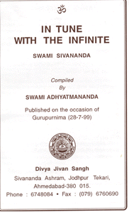 In Tune with the Infinite This booklet was published on the occasion of Gurupurnima (July 28, 1999) celebration in Chicago, USA. This is a practical manual giving instruction on how to attain the everlasting peace existing in your own heart and how to be in tune with the Infinite. This booklet will give a lot of practical hints to spiritual aspirants to lead divine life and fulfill the ultimate goal of life, that is liberation.