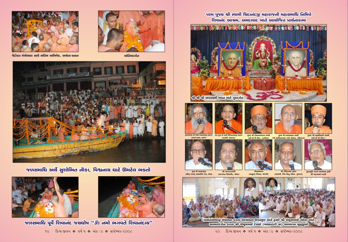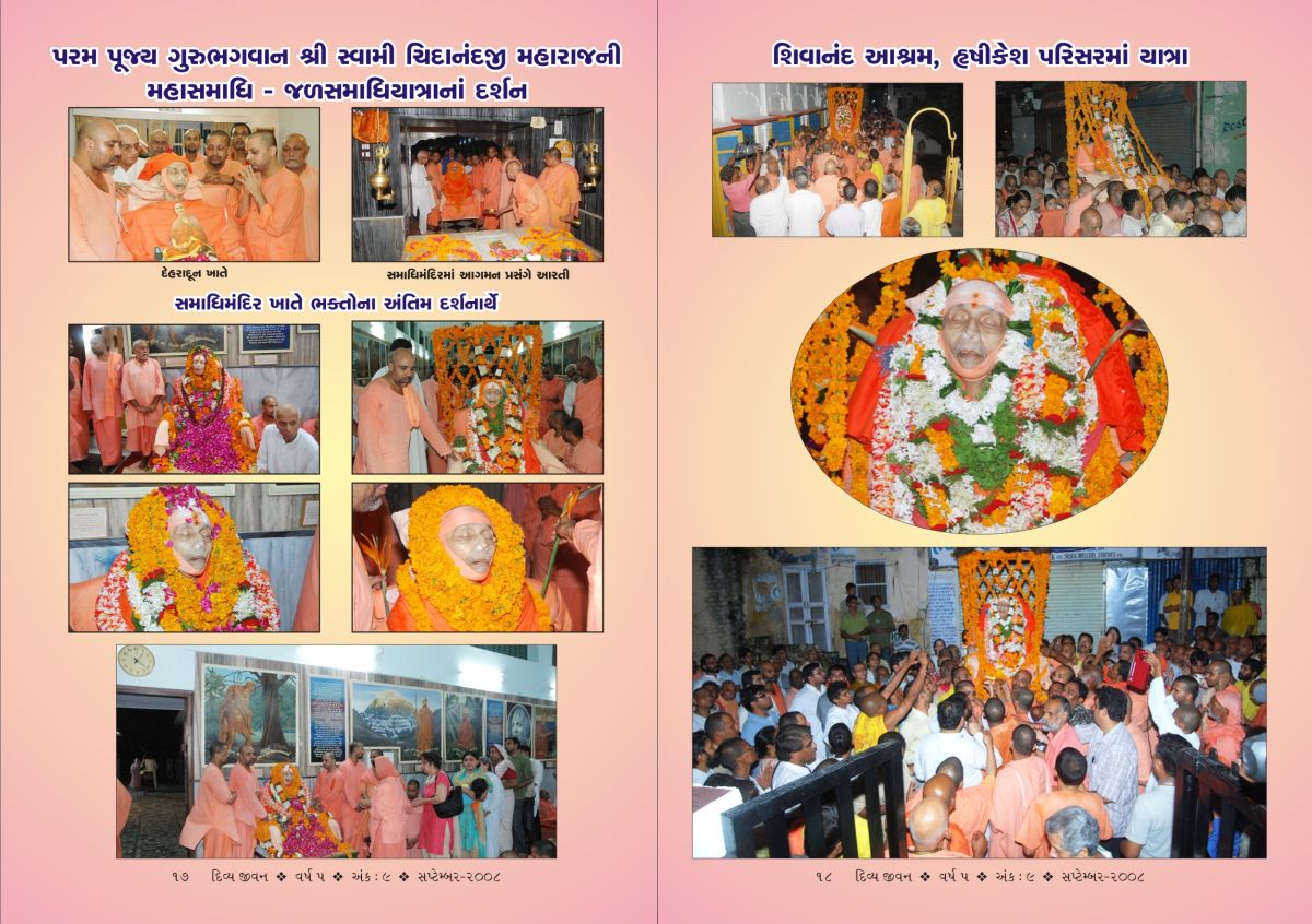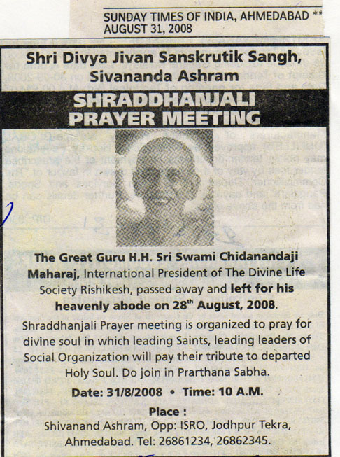 On August 26 , 2008, news was received of missing pulse of H. H Sri Gurudev from Dehradun to Sivanand Ashram(Ahmedabad), which was immediately conveyed to Sri Swami Adhyatmandaji, who was on His "Divya Tour 2008" to the west in Milwaukee (USA). Upon Swamiji’s instructions,  Sri Birendra Das, inmate of Sivananda Ashram, Ahmedabad was sent to Dehradun the same day by air to be for the Darshan and service of Sri Gurudev. At the same time, Rs 100,000 charity was immediately sent to Leprosy Colony near Himmatnagar (Gujarat) and poor feeding was organized simultaneously. Akhand MahaMrityunjaya Mantra Japa was commenced by a large number of devotees at the Ashram Temple. On August 28, 2008, upon receipt of the news of Revered Gurubhagawan’s Samadhi, immediately news was announced through Ashram's website as well as to the local newspapers for the information of devotees to join for prayer meetings at the Sivananda Ashram, Ahmedabad.