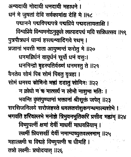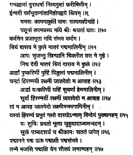 (13-14) Invoke for me, O Agni, Lakshmi who shines like gold, is brilliant like the sun, who is powerfully fragrant, who wields the rod of suzerainty, who is the form of supreme rulership, who is radiant with ornaments and is the goddess of wealth. Invoke for me O Agni, the Goddess Lakshmi who shines like gold, blooms like the moon, who is fresh with anointment (of fragrant scent), who is adorned with the lotuses (lifted up by celestial elephants in the act of worship), who is the presiding deity of nourishment, who is yellow in colour, and who wears garlands of lotuses.