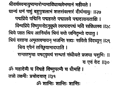 (9-10) I hereby invoke Lakshmi (Shri), whose (main) avenue of perception is the odoriferous sense (i.e., one who abides mainly in cows); who is incapable of defeat or threat from anyone; who is ever healthy (with such virtuous qualities as truth); whose grace is seen abundantly in the refuse of cows (the cows being sacred); and who is supreme over all created beings. O Lakshmi! May we obtain and enjoy the fulfillment of our desires and our volitions, the veracity of our speech, the wealth of cattle, the abundance of varieties of food to eat! May prosperity and fame reside in me (thy devotee)!