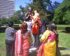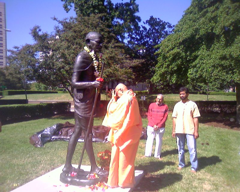 Charlotte, North Carolina (Sept 29, 2008 - Oct 1, 2008)Upon sincere and loving invitation of Smt. Bhavani Sarkar, Sri Swamiji arrived at Charlotte on Sept 29th. It was a Navaratri worship time. During His stay at Charlotte, Swamiji conducted Durga pooja, Sri Satyanaryan pooja and satsang at various devotees' homes. Charlotte Indian association was to unveil the statue of Pujya Mahatama Gandhiji on Sunday, Oct 5th. But as, October 2nd happened to be Revered Gandhi Bapuji's actual birth date , before leaving charlotte Sri Swami Adhyatmandaji Maharaj worshiped Bapuji and conducted all religion prayer, which gave him heart content of peace & joy, because each year Swamiji leads all religion prayers at Gandhi Ashram, Sabaramati (Ahmedabad)