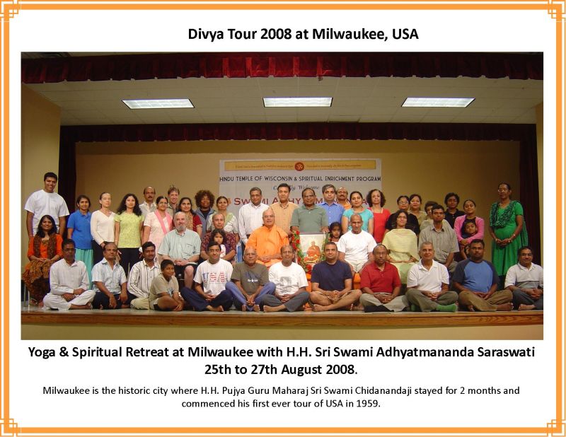 Pujya Swamiji conveys His sincere thanks to the organizers & devotees who have joined Him in His Mission of the Service to Humanity. Revered Swamiji Maharaj and Divya Jivan Sanskrutik Sangh (India –US) are highly indebted to Sri Ajit Bhatia for looking after books, CD's & DVD's distribution work, Sri Nitin Desai for auditing work and Smt. Meera & Sri Anil Lal for accounting the entire money transaction work. Revered Sri Swamiji's "Divya Tour 2008" unfolded from Chicago, a mother center for His tours with the Grace & Blessings of Holy Master Sri Swami Sivanandaji Maharaj and it took a shape as per His Will only.