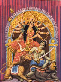 Durga Puja or Navaratri commences on the first and ends on the tenth day of the bright half of Aswayuja (September-October). It is held in commemoration of the victory of Durga over Mahishasura, the buffalo-headed demon. In Bengal Her image is worshipped for nine days and then cast into water. The tenth day is called Vijaya Dasami or Dussera (the “tenth day”). Processions with Her image are taken out along the streets of villages and cities.