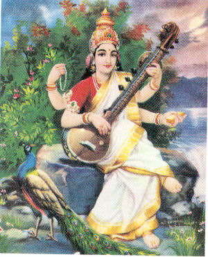 Once the aspirant succeeds in routing out the evil propensities, and develops Sattwic or pure, divine qualities, he becomes competent to attain wisdom. He is now ready to receive the light of supreme wisdom. He is fit to receive divine knowledge. At this stage comes the devout worship of Mother Saraswathi, who is divine knowledge personified, the embodiment of knowledge of the Absolute. The sound of Her celestial veena awakens the notes of the sublime utterances of the Upanishads which reveal the Truth, and the sacred monosyllable, Om. She bestows the knowledge of the supreme, mystic sound and then gives full knowledge of the Self as represented by Her pure, dazzling snow-white apparel. Therefore, to propitiate Saraswathi, the giver of knowledge, is the third stage.