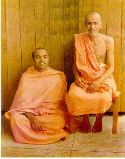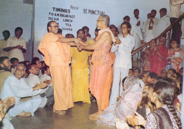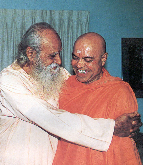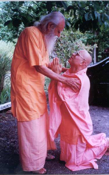 Revered H. H. Sri Swami Satchidanandaji Maharaj extending a warm welcome to Sri Swami Adhyatmanandaji at the Satchidananda Ashram in Yogaville, VA