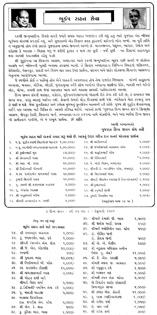 Ref. To thy sincere effort for serving the earthquake victims Kutch, Gujarat, India. We are at Sivananda Ashram the Divine Life Society (here we are known as Divya Jivan Sanskrutik Sangh and our registered body is known as Gujarat Divya Jivan Sangh, we receive our donation in this name only) existing our most humble way to serve the mankind in the name of our most worshipful and Rev. Gurudev Sri Swami Sivanandaji Maharaj.