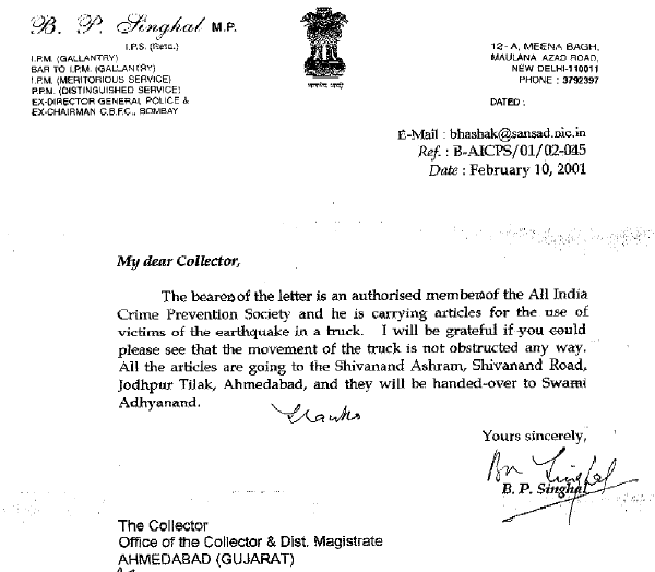 For Gujarat Earthquake Relief Efforts