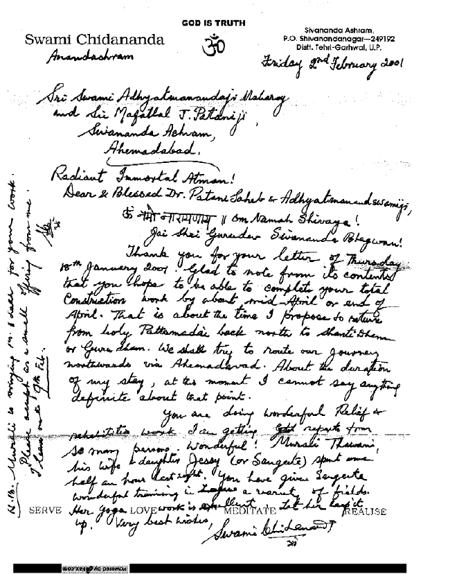 Letter from Guru Maharaj Sri Swami Chidanandaji to Sri Swami Adhyatmanandaji - Feb 9, 2001