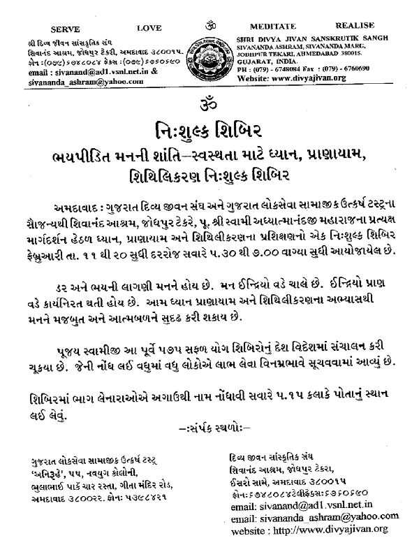 Free Camp to get rid of fear and stress, at Sivananda Ashram, Ahmedabad - Feb 8, 2001