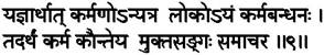 Human beings are bound by work (Karma) that is not performed as a selfless service (Seva, Yajna). Therefore, O Arjuna, becoming free from selfish attachment to the fruits of work, do your duty efficiently as a service to Me. (3.09)
